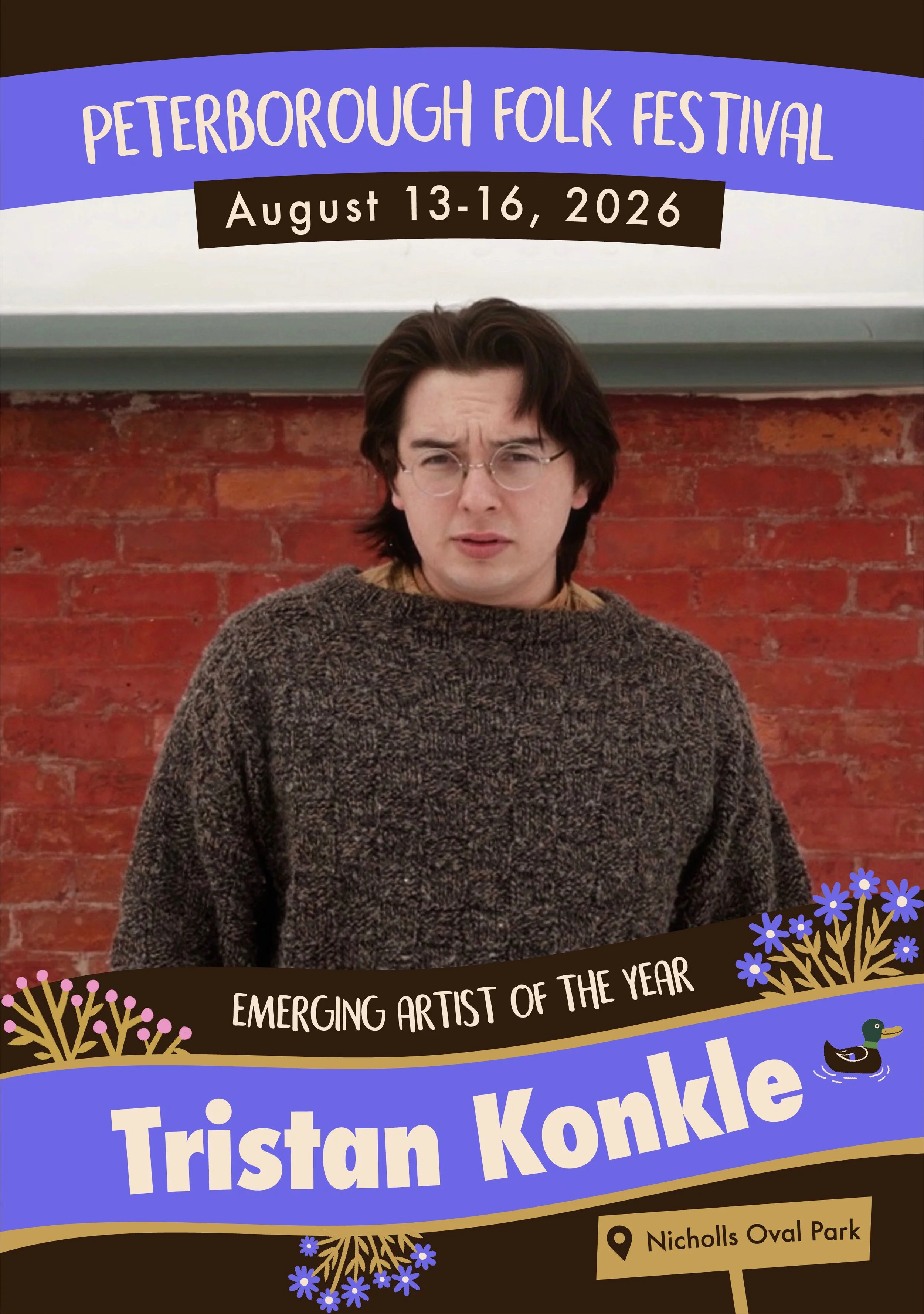 Tristan Konkle is the Peterborough Folk Festival 2026 Emerging Artist of the Year!